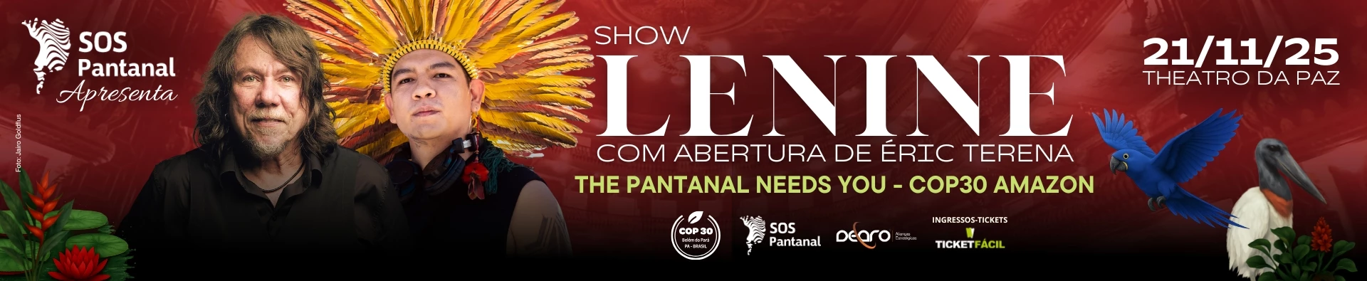 O espetáculo LENINE - Uma noite inesquecível em prol do Pantanal na COP30 com abertura de Eric Terena, é uma oportunidade única de presenciar o artista que transforma em versos as questões, os amores e as sagas de seu tempo. Histórias à base de palavra e música: elementos que, para ele, andam juntos desde sempre